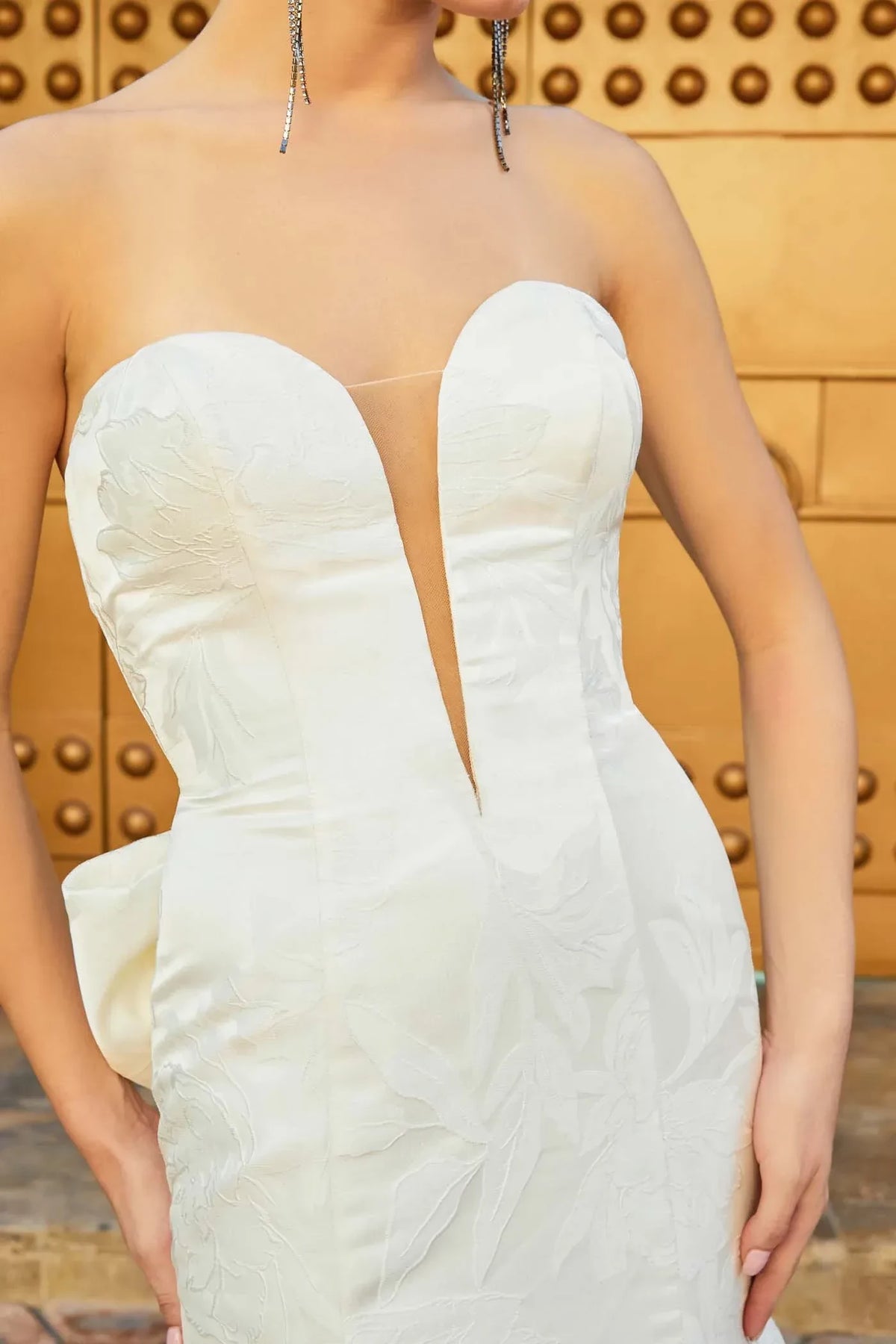 Light up your wedding day with this dazzling trumpet dress. The sweetheart neckline radiates romance, and the sleeveless design keeps it fresh. The bow back detail adds a playful yet elegant touch, while the floor-length skirt flows beautifully, making it perfect for your special celebration.