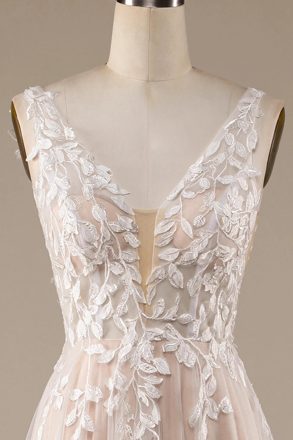 This ethereal dress showcases an A line silhouette for a graceful fit. The deep V neck design adds a touch of allure, while the sleeveless style keeps it light and airy. The open back creates a captivating look, and the floor length skirt, adorned with delicate leaf like lace, makes for a truly dreamlike and memorable appearance, perfect for a wedding ceremony.