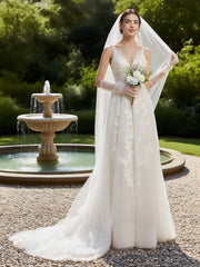 refined dress features an A line silhouette, offering a flowing and graceful look. The deep V neck design exudes elegant charm, while the sleeveless style keeps it sleek and modern. The open back adds a touch of alluring sophistication, and the floor length skirt, adorned with delicate lace and a beautiful train, creates a truly elegant and unforgettable style, perfect for a wedding ceremony.