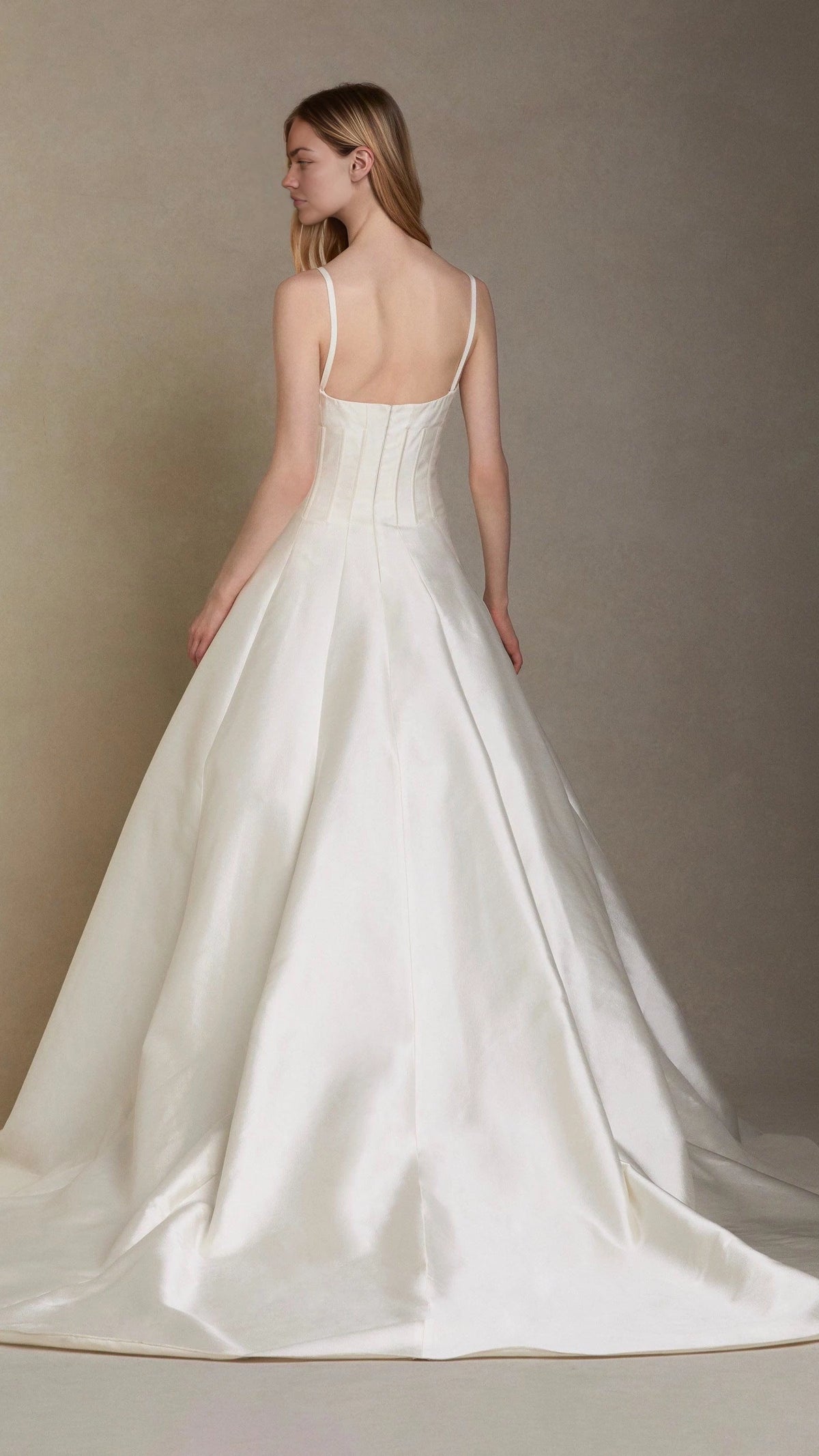 This refined dress features a ball gown silhouette for a grand, voluminous look. The square neck design exudes elegance and sophistication, while the spaghetti straps keep it sleek and delicate. The open back creates an alluring and graceful appearance, and the floor length skirt, with its smooth fabric and beautiful drape, makes for a truly elegant and memorable style, perfect for a wedding ceremony.