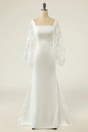 sophisticated dress features a mermaid silhouette that beautifully accentuates the figure. The square neck design exudes a classic charm, while the lace long sleeves add a touch of delicacy and elegance. The tie back style creates a customizable and charming look, and the floor length skirt, with its smooth fabric and subtle lace details, makes for a truly refined and memorable appearance, perfect for a wedding ceremony.