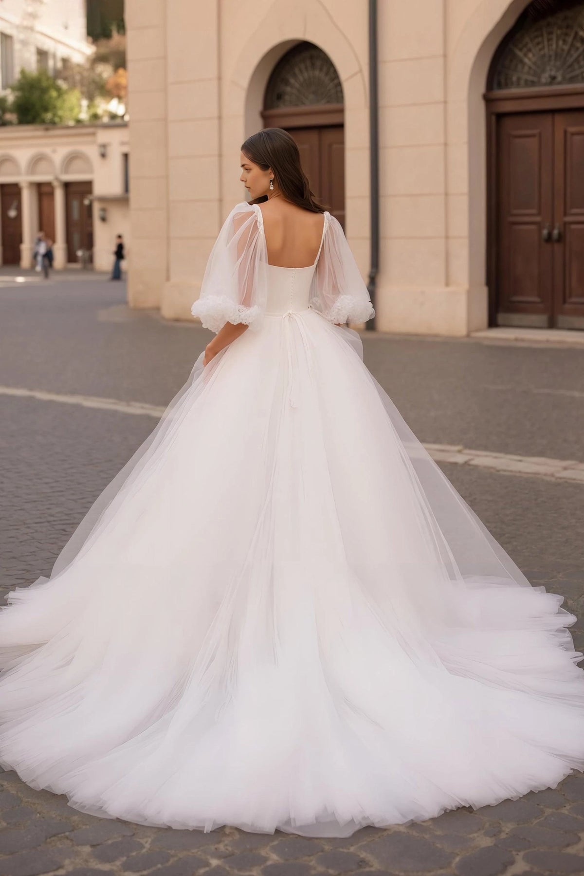 refined dress features a princess silhouette, offering a voluminous and regal look. The square neckline exudes elegant charm, while the puff sleeves add a touch of romantic flair. The tie back design brings delicate detail, and the floor length skirt, with its soft tulle fabric and beautiful train, creates a truly elegant and unforgettable style, perfect for a wedding ceremony.