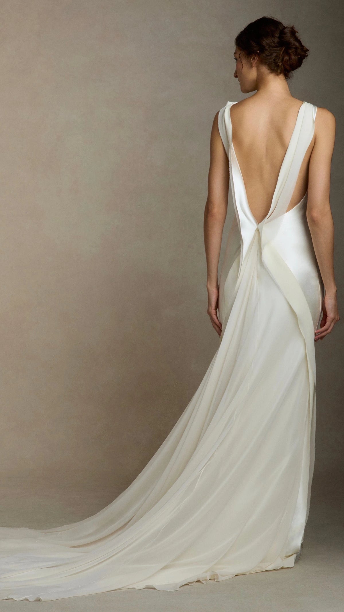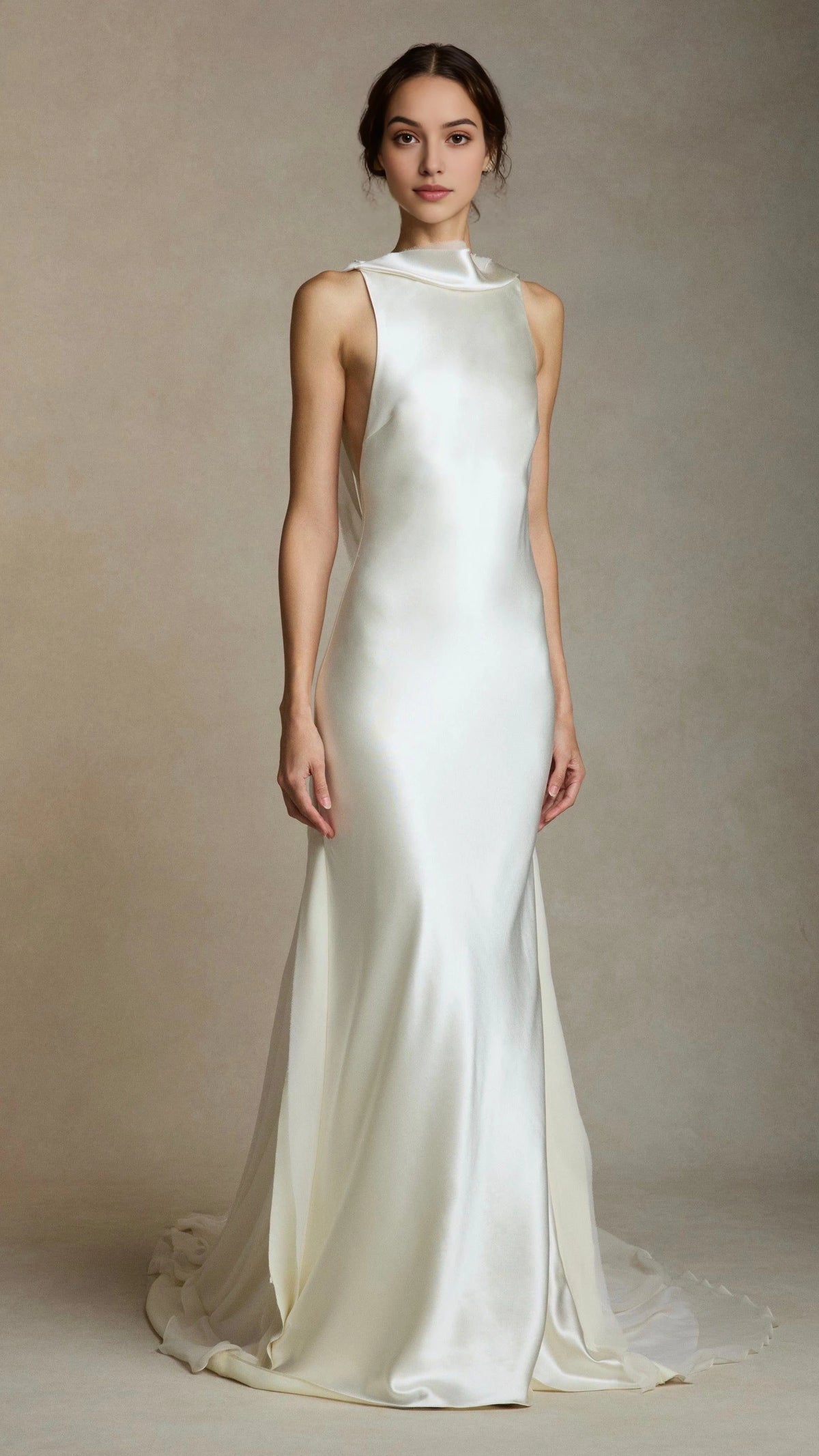 This refined dress features a trumpet silhouette that hugs the body and flares out elegantly. The high neck design exudes elegance and sophistication, while the sleeveless style keeps it sleek and airy. The open back creates an alluring and graceful appearance, and the floor length skirt, with its smooth satin fabric and beautiful drape, makes for a truly elegant and memorable style, perfect for a wedding ceremony.