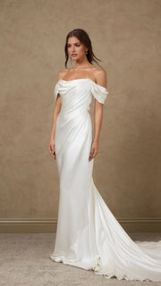 This refined dress features a trumpet silhouette that hugs the body and flares out elegantly. The off the shoulder neckline exudes elegance and allure, while the short sleeves add a touch of delicate charm. The V back creates an alluring and graceful appearance, and the floor length skirt, with its smooth satin fabric and beautiful drape, makes for a truly elegant and memorable style, perfect for a wedding ceremony.