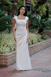 Step into elegance on your wedding day with this trumpet dress. The square neckline offers a classic look, and the cap sleeves add a refined touch. The button back style brings timeless charm, while the floor length skirt flows beautifully, making it perfect for your special celebration.