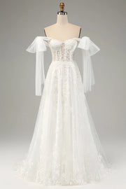 Step into enchantment with this A line dress. It has a sweetheart neckline for a romantic allure, off shoulder sleeves for an elegant and dreamy look, and a lace up back that adds a touch of sophistication and allows for a customized fit. The maxi length makes it perfect for wedding occasions, ensuring you look absolutely stunning.