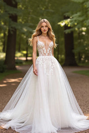 Enchanting Ball Gown Deep V Neck Spaghetti Strap Open Back Floor Length Wedding Dress