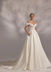 This wedding dress boasts an enchanting ball gown silhouette, an off-shoulder neckline, and floral short sleeves with delicate detailing. The lace-up back design adds a romantic flair, while the long-length cut creates a majestic look for your wedding occasion. It fuses intricate lace and voluminous fabric, ensuring you radiate charm and elegance on your special day.