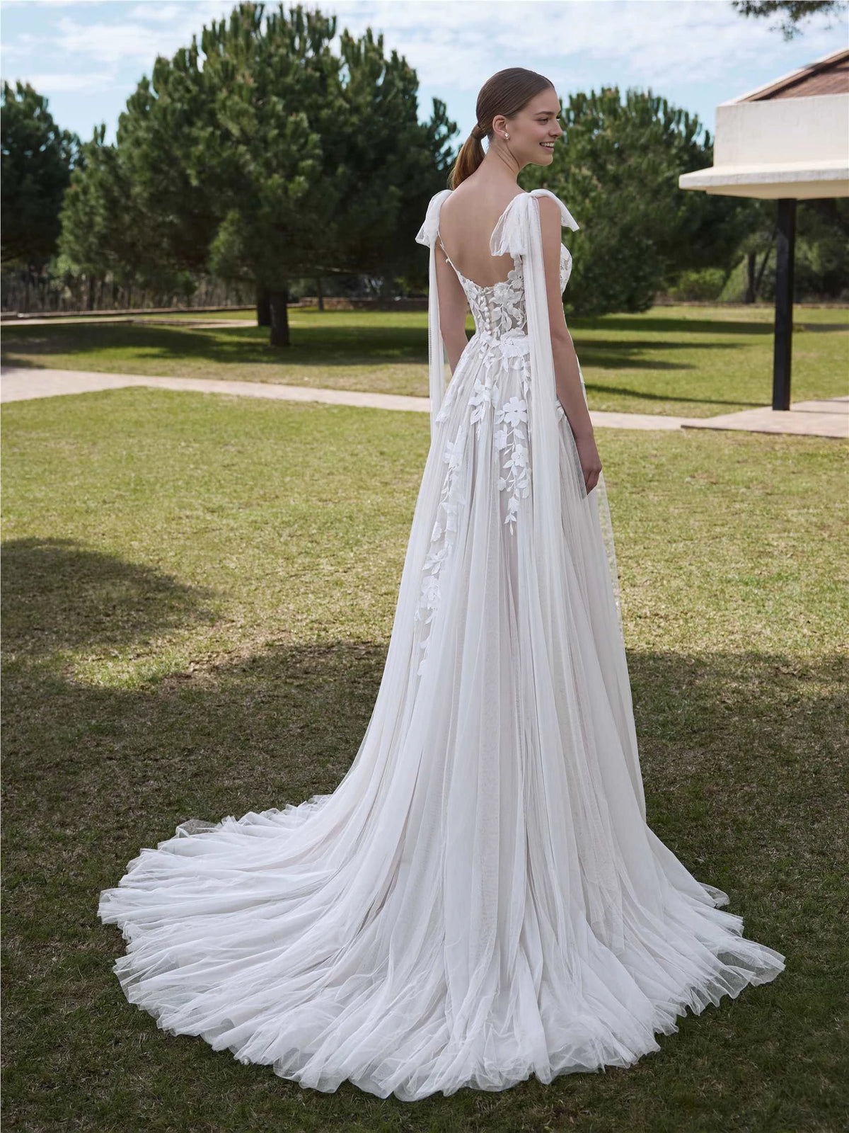 This airy dress boasts an A line silhouette for a flowing, graceful look. The sweetheart neckline radiates romance, while the cape sleeves add a whimsical, dreamy touch. The open back lends an alluring vibe, and the floor length skirt, with delicate floral details and soft tulle fabric, creates an ethereal and unforgettable style, perfect for a wedding.