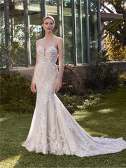 This stunning dress features a mermaid silhouette that hugs the body and flares out elegantly. The sweetheart neckline exudes exquisite charm, while the sleeveless style keeps it sleek and modern. The lace up back adds a touch of delicate sophistication, and the floor length skirt, adorned with intricate floral lace, creates a truly exquisite and unforgettable style, perfect for a wedding ceremony.