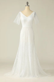 Glamorous A Line Deep V Neck Short Sleeve Open Back Wedding Dress occasion: Bridal showers Red carpet events Upscale parties Masquerade balls Formal corporate events White tie events Female guests