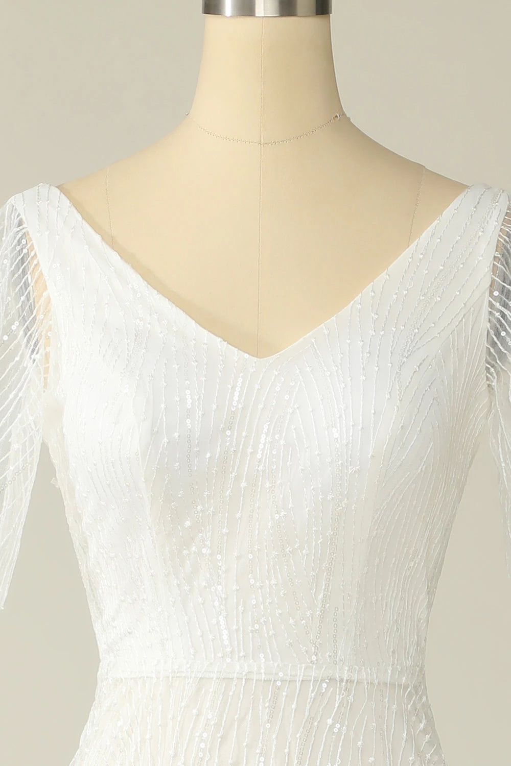 Dazzling dress showcases an A line silhouette for a graceful fit. The deep V neck design adds a touch of allure, while the short sleeves bring a delicate and elegant vibe. The open back creates a captivating look, and the floor - length skirt, with its shimmering fabric and intricate detailing, makes for a truly glamorous and memorable appearance, perfect for a wedding ceremony.