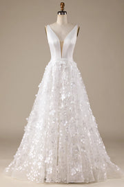 stunning dress features an A line silhouette for a graceful fit. The deep V neck design adds a touch of allure, while the sleeveless style keeps it sleek. The open back creates a captivating look, and the floor length skirt, adorned with delicate floral details, makes for a truly glamorous and memorable appearance, perfect for a wedding ceremony.