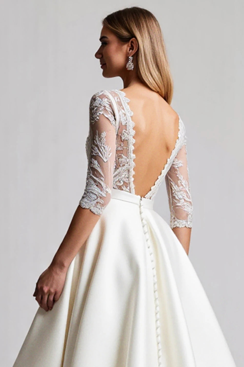 Glamorous Ball Gown Deep V Neck Lace Half Sleeve Plunging Back Floor Length Wedding Dress - US 2 / UK 6 / EU 32