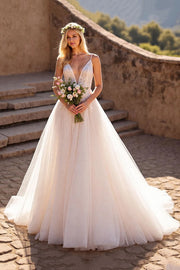 Glamorous Ball Gown Deep V Neck Spaghetti Strap Open Back Floor Length Wedding Dress