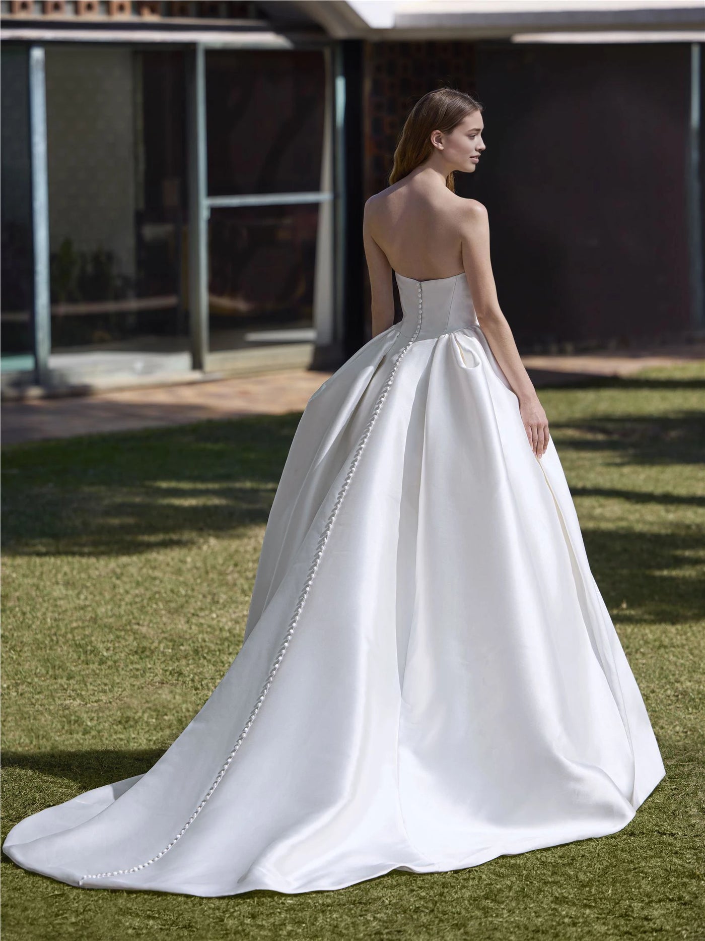 This dazzling dress features a ball gown silhouette for a grand, voluminous look. The strapless neckline exudes glamour and allure, while the sleeveless style keeps it sleek and chic. The button back adds a touch of intricate sophistication, and the floor - length skirt, with its smooth satin fabric and beautiful drape, makes for a truly glamorous and memorable style, perfect for a wedding ceremony.
