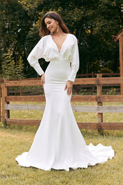 Glamorous Mermaid Deep V Neck Bishop Sleeve Tie Back Maxi Wedding Dress - US 2 / UK 6 / EU 32