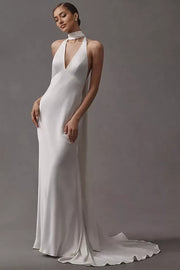 dazzling dress features a sheath silhouette, offering a sleek and form fitting look. The halter neckline exudes glamorous charm, while the sleeveless design keeps it modern and chic. The open back adds a touch of alluring sophistication, and the floor length skirt, with its smooth fabric and elegant train, creates a truly glamorous and unforgettable style, perfect for a wedding ceremony.