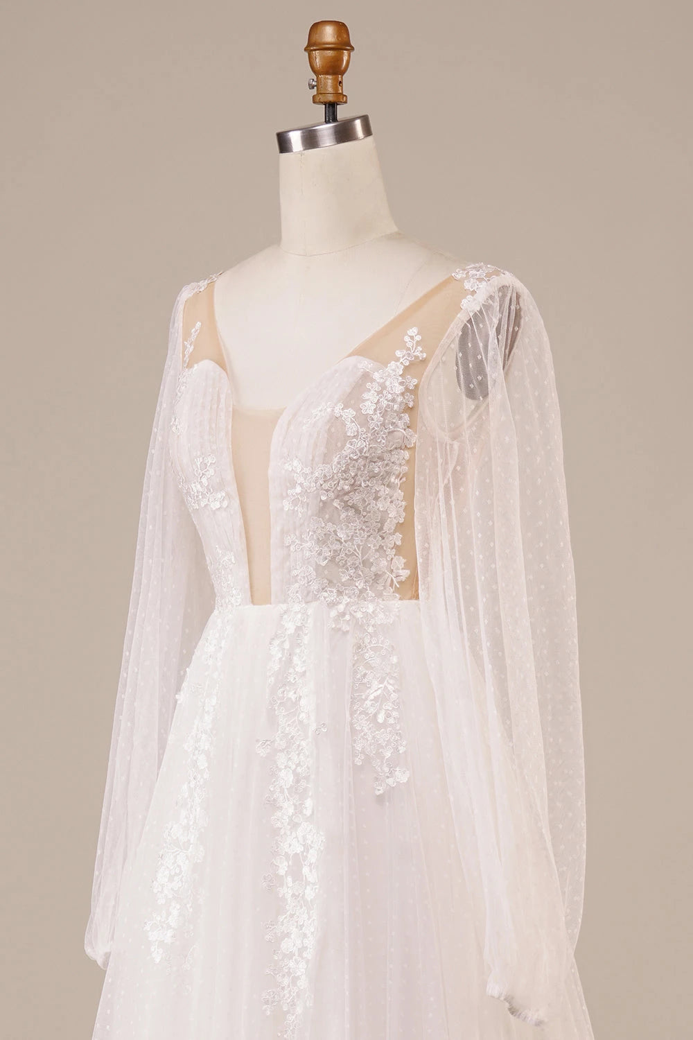 This stunning dress features an A line silhouette that offers a graceful and flowing fit. The deep V neck design adds a touch of allure, while the long sleeves bring elegance and a hint of drama. The open back creates a captivating look, and the floor length skirt, adorned with delicate lace and dotted tulle, makes for a truly breathtaking and memorable appearance, perfect for a wedding ceremony.