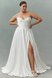 stunning dress features an plus size A line silhouette, offering a flowing and graceful look. The off shoulder neckline exudes gorgeous charm, while the puff sleeves add a touch of delicate allure. The button back brings timeless sophistication, and the floor length skirt, with its smooth fabric and alluring slit, creates a truly gorgeous and unforgettable style, perfect for a wedding ceremony.