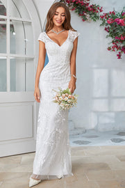 Step into gorgeousness with this mermaid dress. It features a deep V neck for an alluring look, cap sleeves for a delicate touch, and an open back that adds a hint of romance. The maxi length makes it perfect for wedding occasions, ensuring you look absolutely stunning.