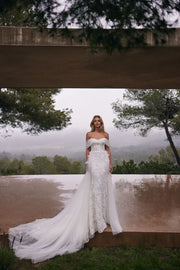 This wedding dress features a gorgeous off shoulder mermaid silhouette with lace floral accents and a zip back design that offer a romantic and sophisticated look. The train length cut adds a touch of elegance, making it perfect for wedding ceremonies, ensuring you look stylish and confident.