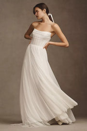 charming dress features an A line silhouette, offering a flowing and elegant look. The off the shoulder neckline exudes graceful charm, while the convertible sleeves add a versatile and stylish touch. The open back provides a sleek and alluring detail, and the floor length skirt, with its soft fabric and beautiful drape, creates a truly graceful and unforgettable style, perfect for a wedding ceremony.