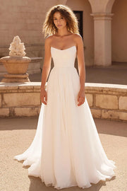 elegant dress features an A line silhouette that offers a flowing and airy look. The strapless neckline exudes graceful charm, while the sleeveless style keeps it sleek and refined. The open back adds a touch of alluring sophistication, and the floor length skirt, with its light fabric and beautiful train, creates a truly graceful and unforgettable style, perfect for a wedding ceremony.