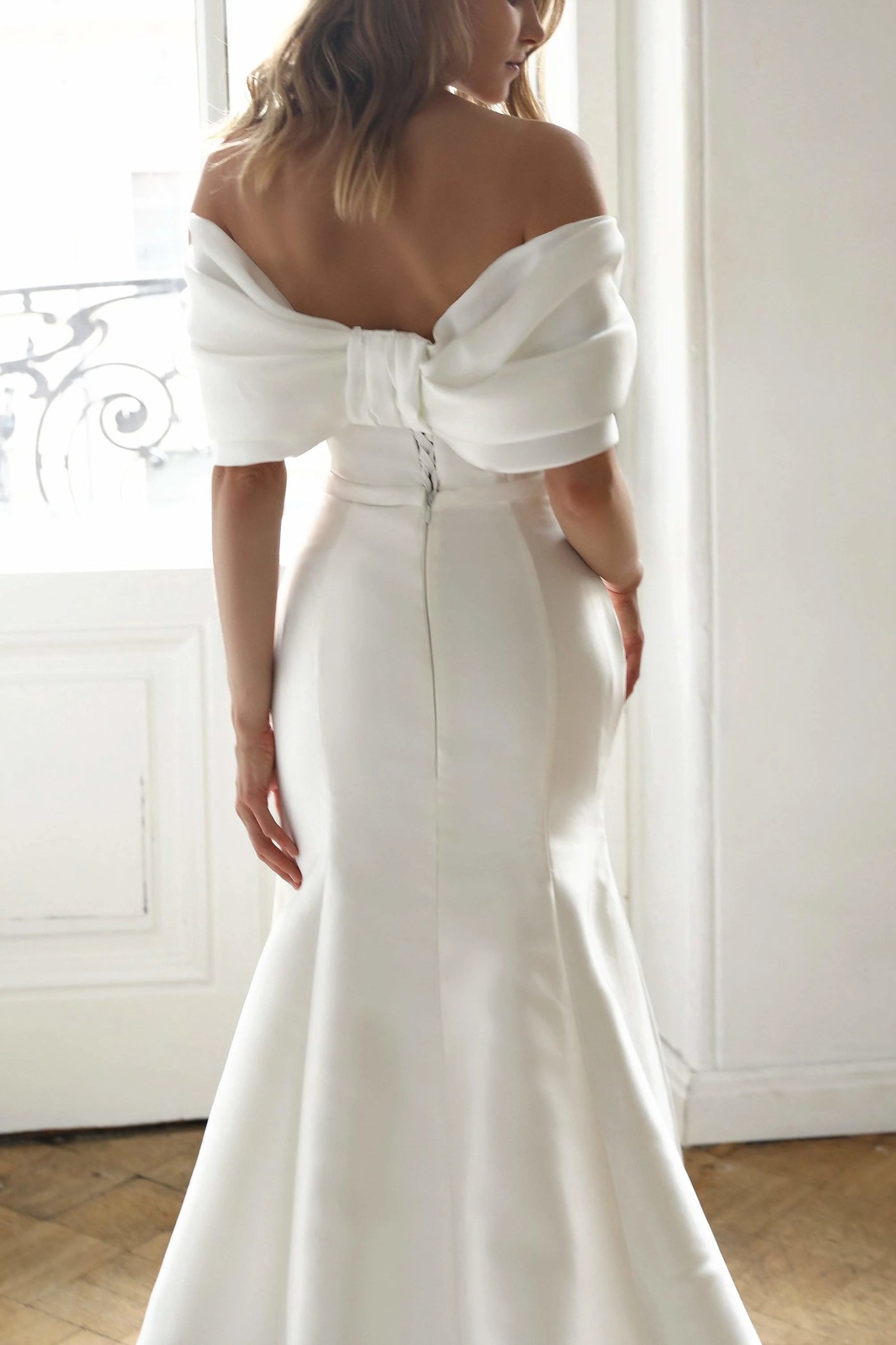 opulent dress features a mermaid silhouette that hugs the body and flares out elegantly. The off the shoulder neckline exudes luxurious charm, while the short sleeves add a touch of refined detail. The lace up back provides a classic and adjustable element, and the floor length skirt, with its smooth fabric and beautiful train, creates a truly luxurious and unforgettable style, perfect for a wedding ceremony.