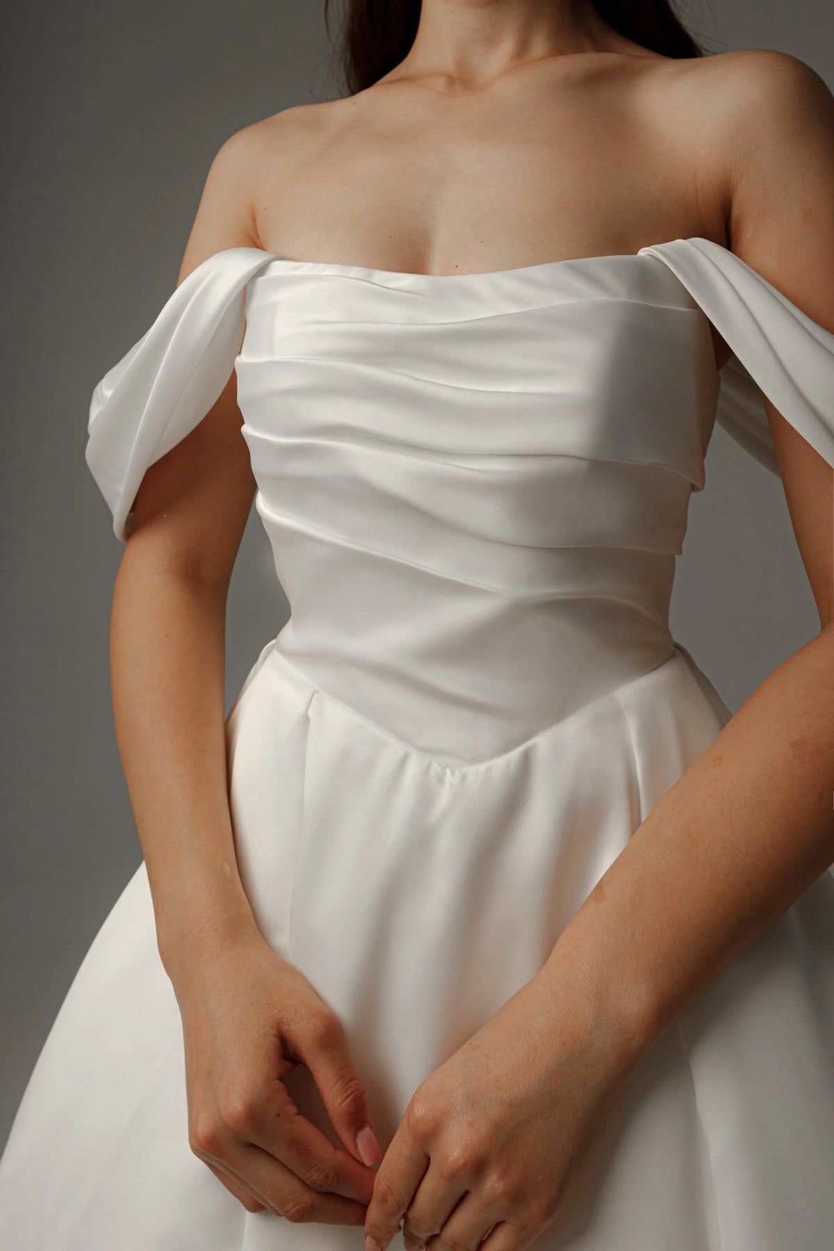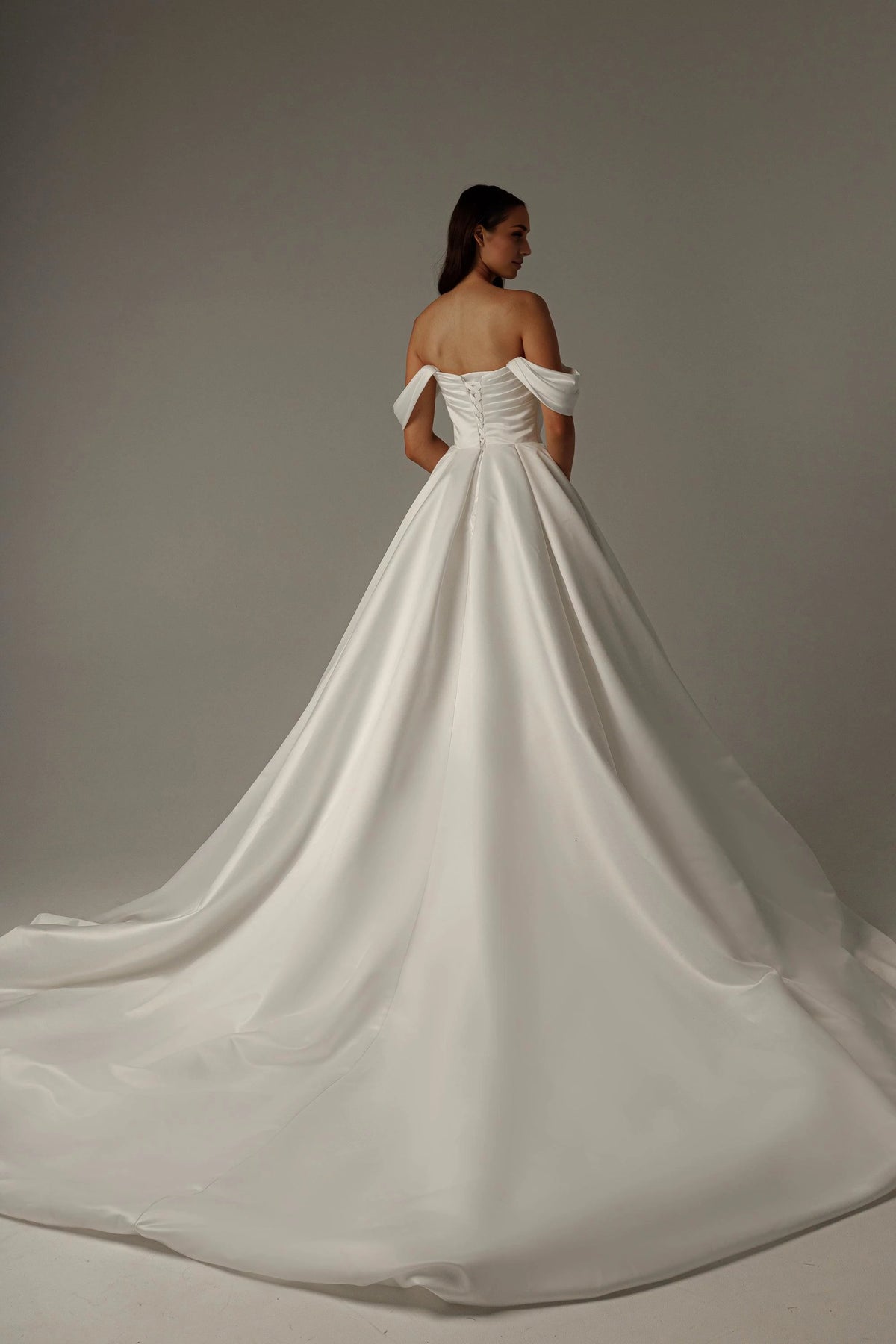 magnificent dress features a princess silhouette, offering a voluminous and regal look. The off shoulder neckline exudes luxurious charm, while the draped sleeves add a touch of elegant drama. The lace up back brings timeless sophistication and a customizable fit, and the floor length skirt, with its smooth, lustrous fabric, creates a truly luxurious and unforgettable style, perfect for a wedding ceremony.