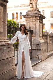 This wedding dress features a modern sheath silhouette, a stylish wrap V-neck, and elegant bishop long sleeves. The open back design adds a contemporary touch, while the long-length cut with a train creates a sophisticated look for your wedding occasion. It combines sleek lines and flowing fabric, ensuring you exude modern elegance on your special day.