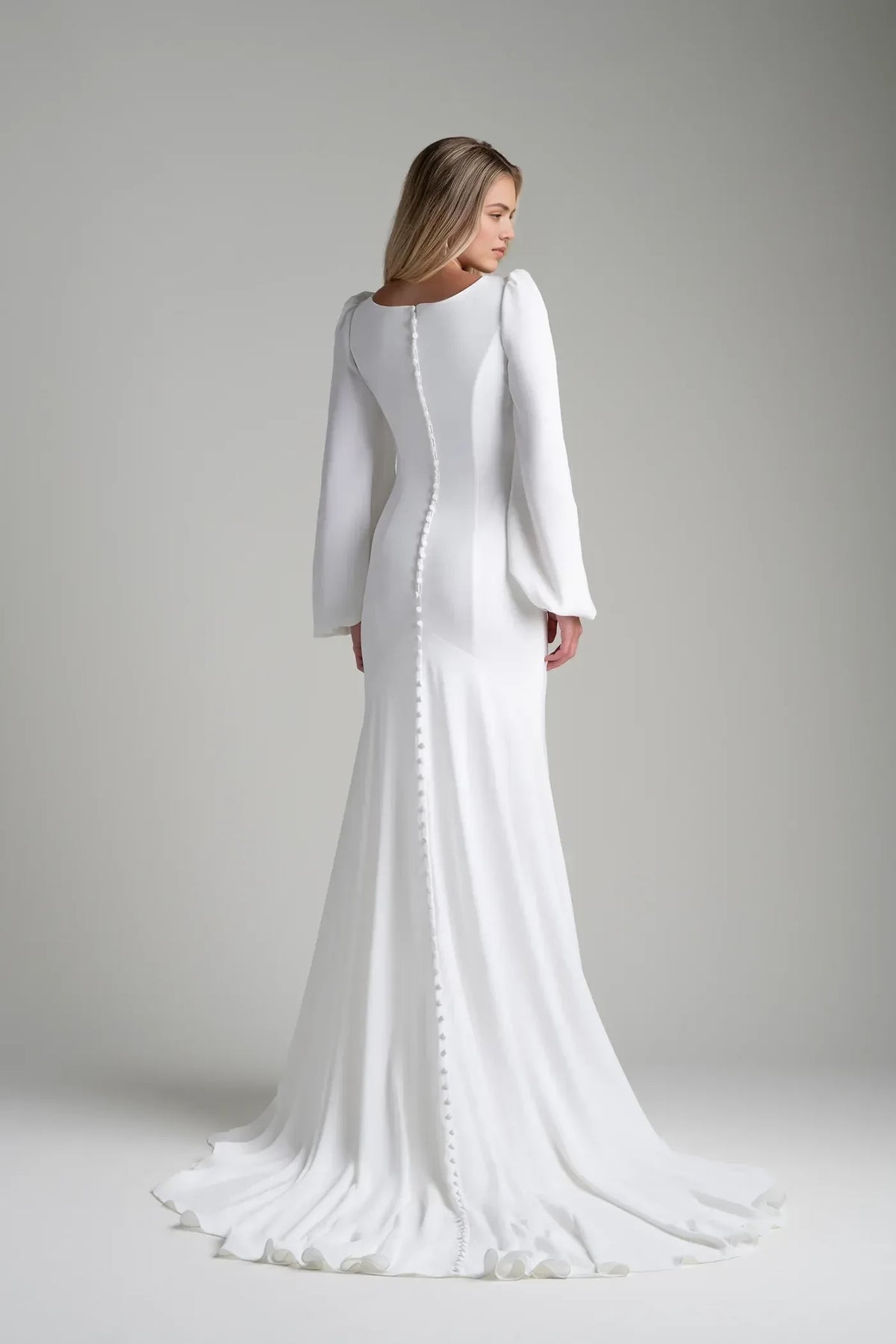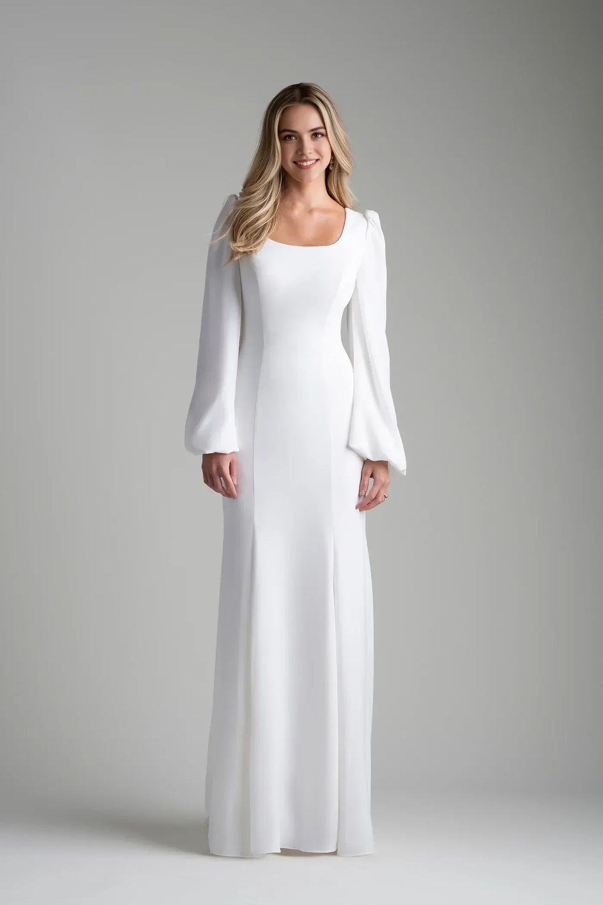 Step into your wedding day with polished grace in this trumpet dress. The square neckline offers a sleek look, and the bishop sleeves bring a touch of refined drama. The button-back style adds classic charm, while the floor length skirt flows beautifully, making it perfect for your special celebration.