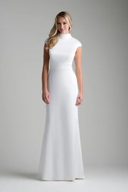 Exude refined elegance on your wedding day with this trumpet dress. The high neck brings a polished look, and the cap sleeves offer a delicate touch. The button back style adds classic charm, while the floor length skirt flows beautifully, making it perfect for your special celebration.