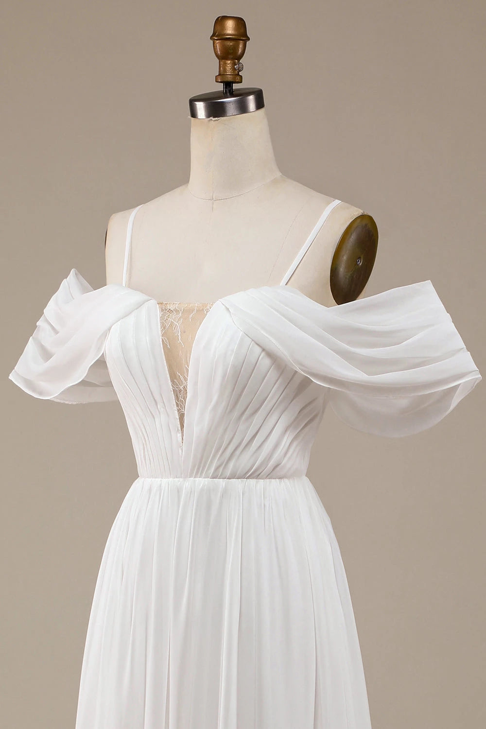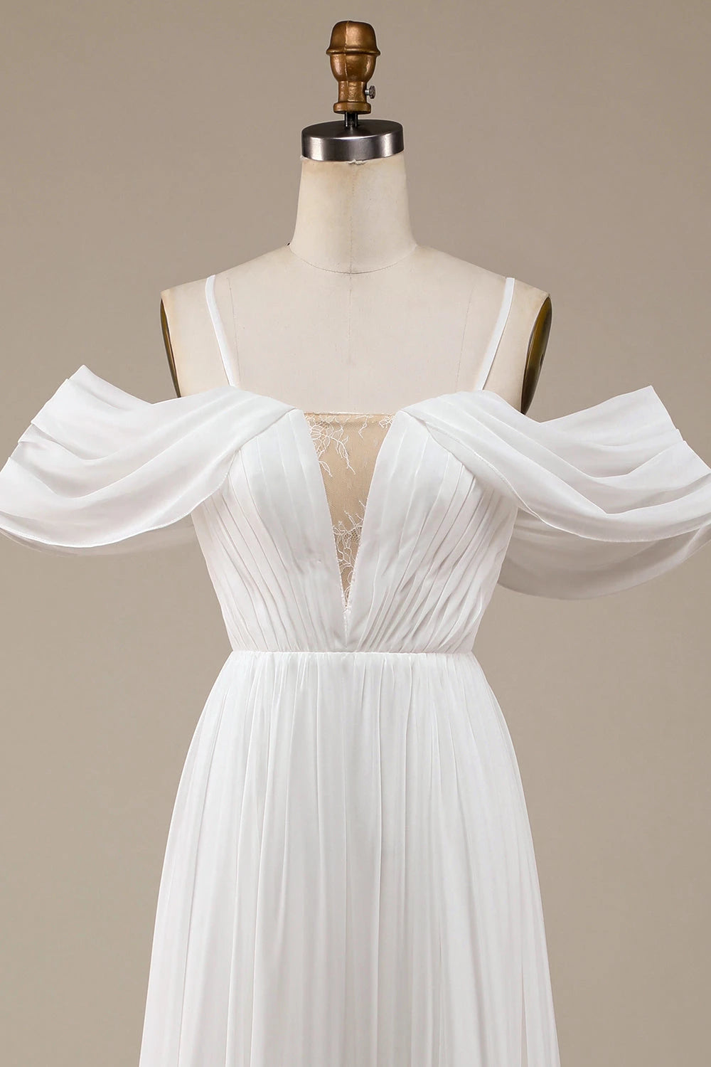This dreamy dress features an A line silhouette for a graceful fit. The deep V neck design adds a touch of allure, while the off shoulder sleeves bring a romantic and elegant vibe. The open back creates a captivating look, and the floor length skirt, with its flowing fabric and delicate details, makes for a truly enchanting and memorable appearance, perfect for a wedding ceremony.