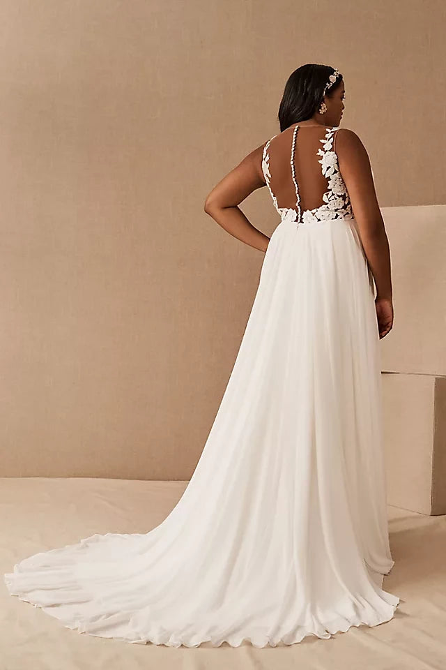 Romantic A Line Deep V Neck Sleeveless Lace Up Back Plus Size Wedding Dress occasion: Bridal showers Red carpet events Upscale parties Masquerade balls Formal corporate events White tie events Female guests