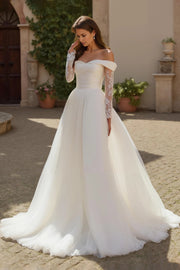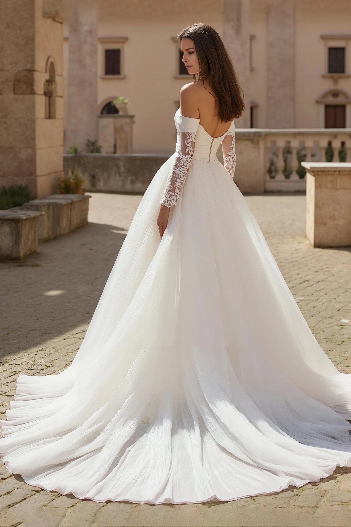 dreamy dress features an A line silhouette, offering a flowing and graceful look. The off shoulder neckline exudes romantic charm, while the lace long sleeves add a touch of delicate allure. The open back brings sophisticated allure, and the floor length skirt, with its soft fabric and beautiful train, creates a truly romantic and unforgettable style, perfect for a wedding ceremony.
