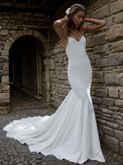 This elegant wedding dress features a ruched V-neckline and sleeveless design, crafted from stretch crepe fabric for a comfortable, flattering fit. The column silhouette gently skims the body, while the sweep train adds a graceful finish, perfect for a sophisticated bridal look. Ideal for brides seeking timeless style with modern comfort.