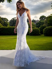 Spaghetti Straps Sleeveless Mermaid Lace Court Train Lace Wedding Dresses - US 2 / UK 6 / EU 32