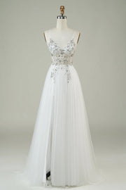 dazzling dress features an A line silhouette for a graceful fit. The deep V neck design adds a touch of allure, while the sleeveless style keeps it light and airy. The open back creates a captivating look, and the floor length skirt, adorned with shimmering beads and sequins, makes for a truly radiant and memorable appearance, perfect for a wedding ceremony.