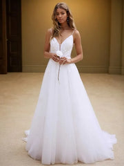 This elegant wedding dress features a flattering V-neckline and sleeveless design, crafted with intricate lace appliques that enhance its princess silhouette. The sweep train adds a graceful touch, perfect for a timeless bridal look. Expertly designed to combine classic charm with delicate detailing, this gown ensures you feel both sophisticated and radiant on your special day.