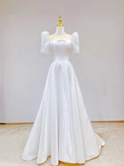White A-Line White Satin Short Sleeve Floor Length Prom Dress Party Dress Wedding Dresses