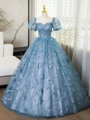 3D Butterfly Applique A Line Puff Sleeves Tulle Lace Gray Blue Sweet Short Sleeves Long Prom Dress Cocktail Dress Homecoming Dress Evening Dress