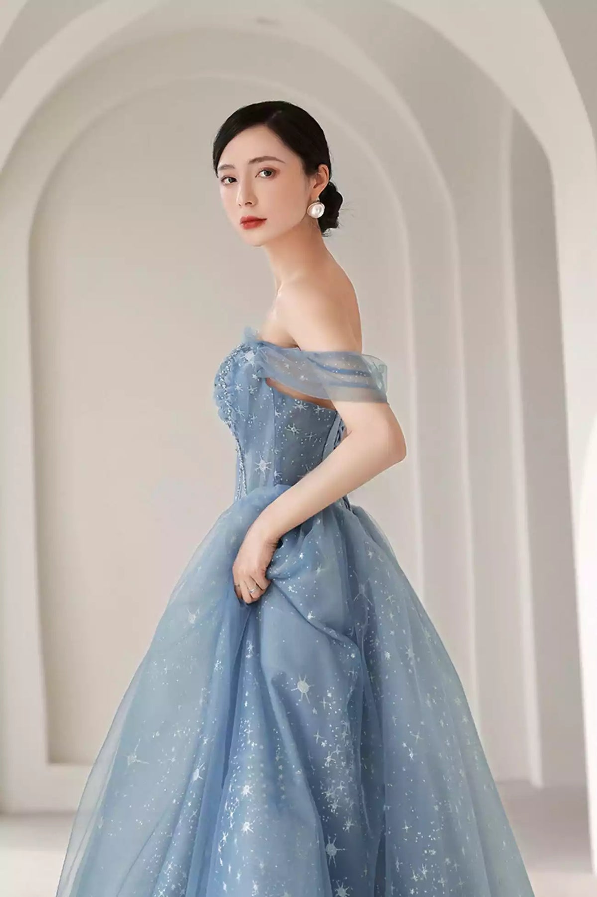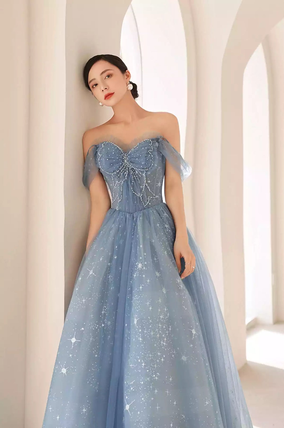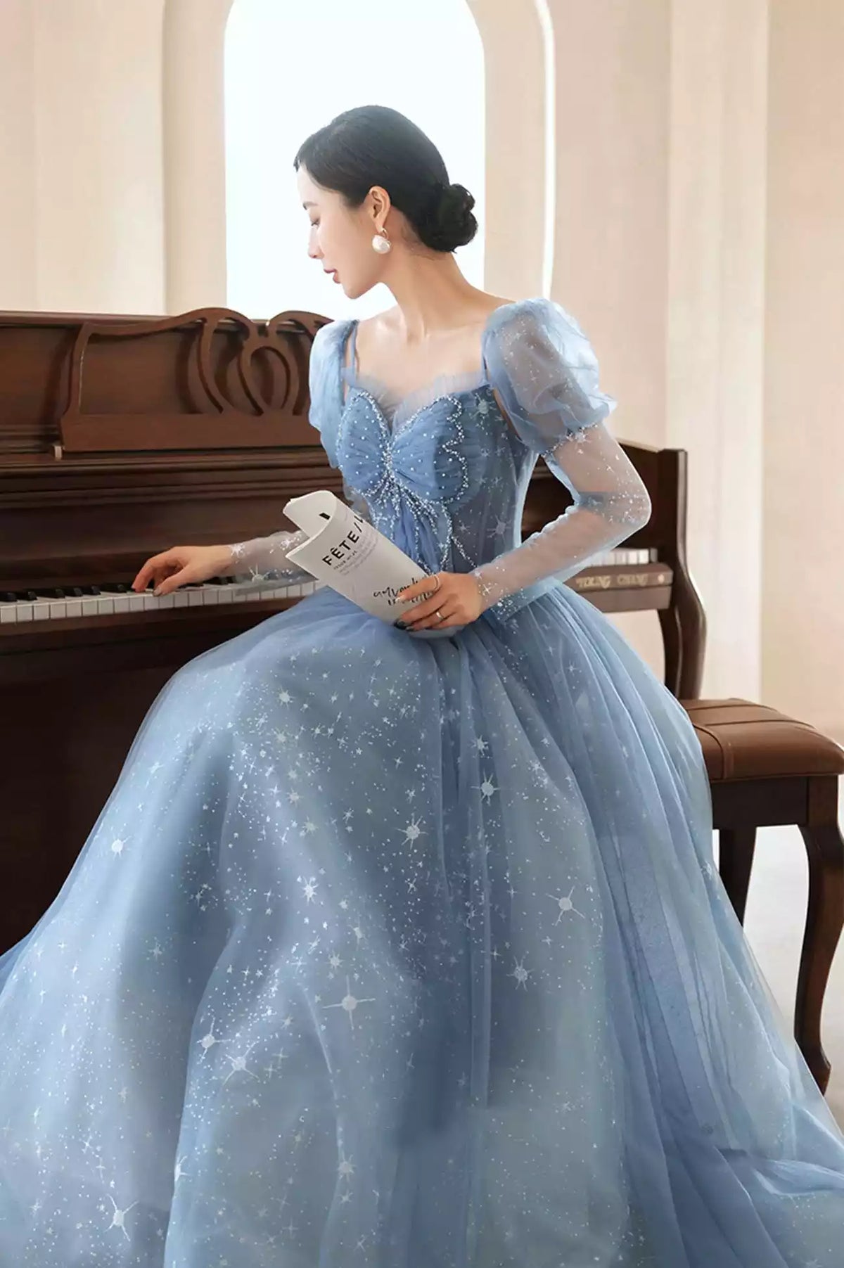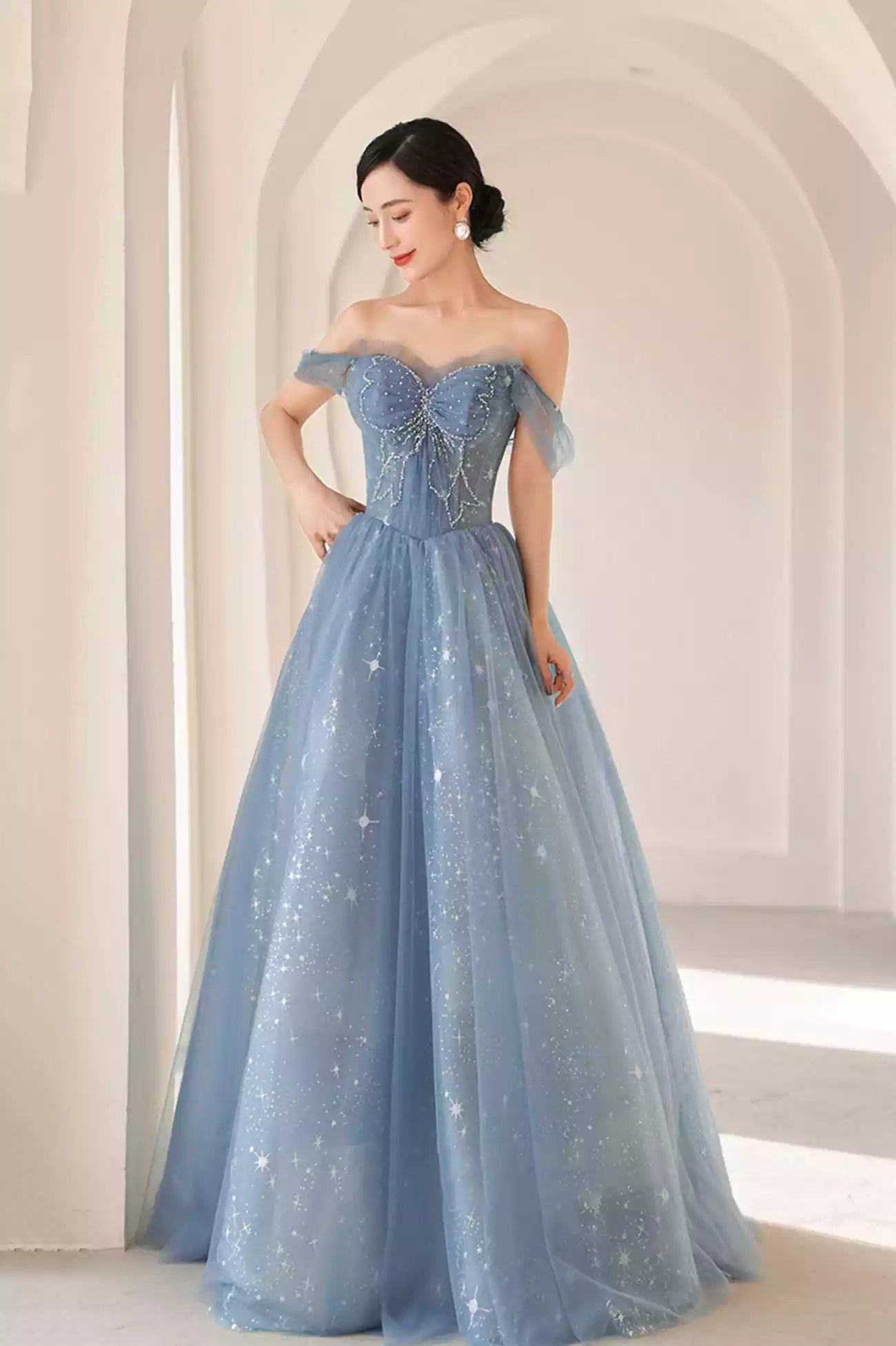 This elegant A-line prom dress features delicate blue tulle adorned with intricate beading, creating a sophisticated and graceful silhouette. Its long, flowing design offers a timeless formal look, perfect for special occasions. The lightweight fabric ensures comfort while maintaining a refined appearance, making it an excellent choice for those seeking both style and elegance.