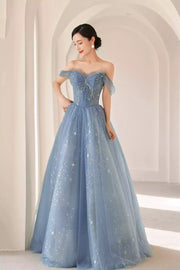 A-Line Blue Tulle Beading Long Prom Dress Blue Formal Dress