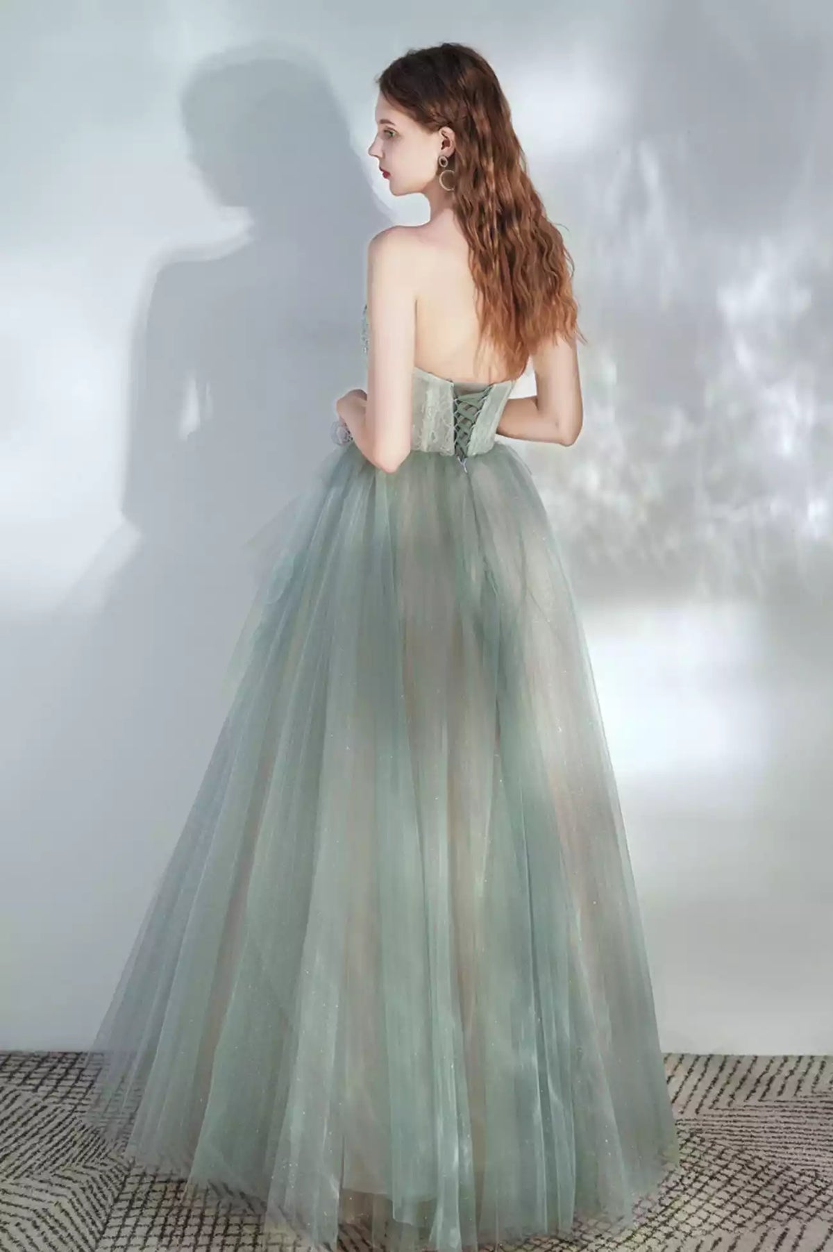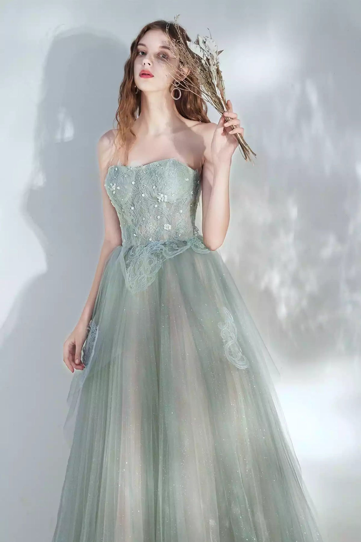 A-Line Green Tulle Lace Strapless Long Formal Dress Evening Party Dress
