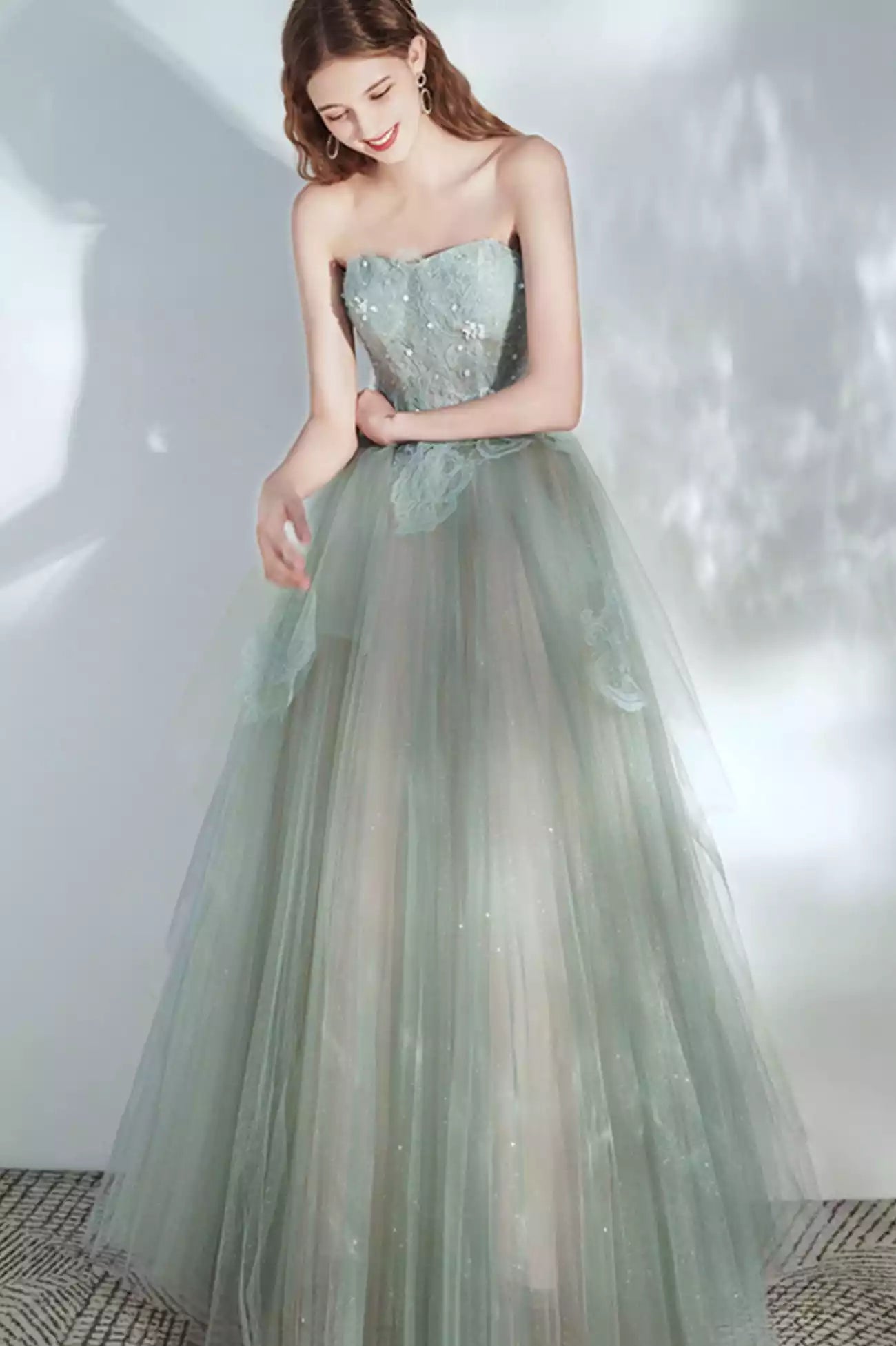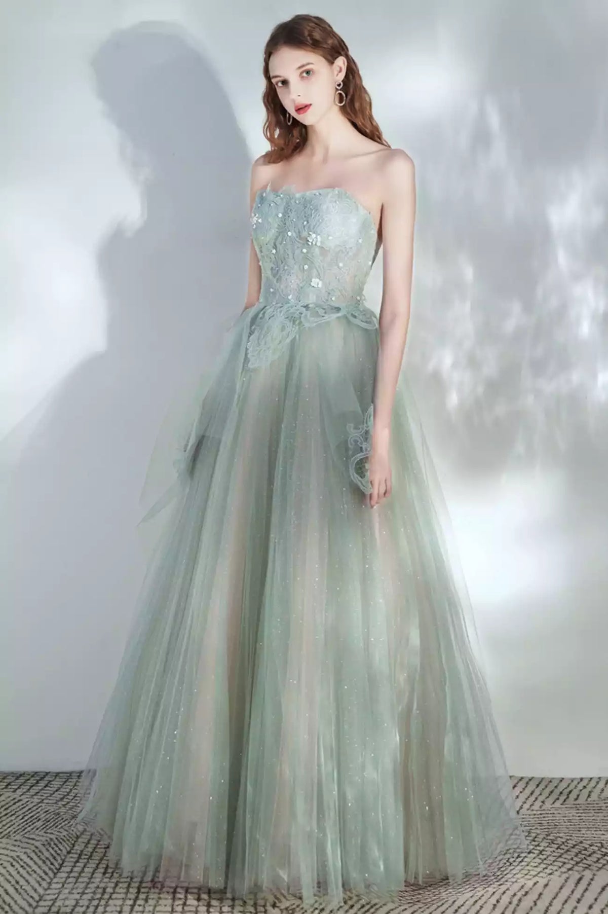 This elegant A-line evening dress features a strapless design crafted from delicate green tulle and intricate lace. Its long silhouette offers a graceful fit, perfect for formal occasions and parties. The combination of lightweight tulle and detailed lace provides both comfort and sophistication, ensuring you stand out with timeless style.