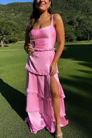 This floor-length evening dress features a striking hot pink A-line silhouette with elegant ruffles and a daring slit for added movement and allure. The sleeveless design and square neckline create a sophisticated frame, while the lace-up back offers a customizable fit and a touch of intricate detail. Perfect for prom or formal occasions, this dress combines classic elegance with modern flair to ensure you stand out with confidence.