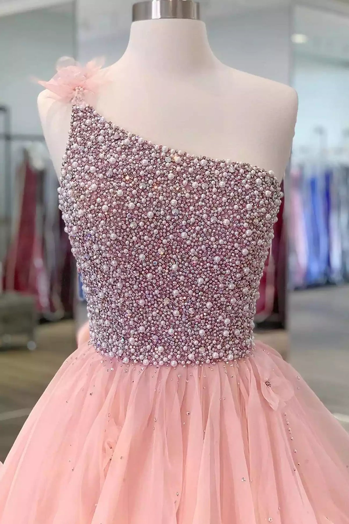 A-Line One Shoulder Pink Organza Beaded Long Formal Dress Evening Dress