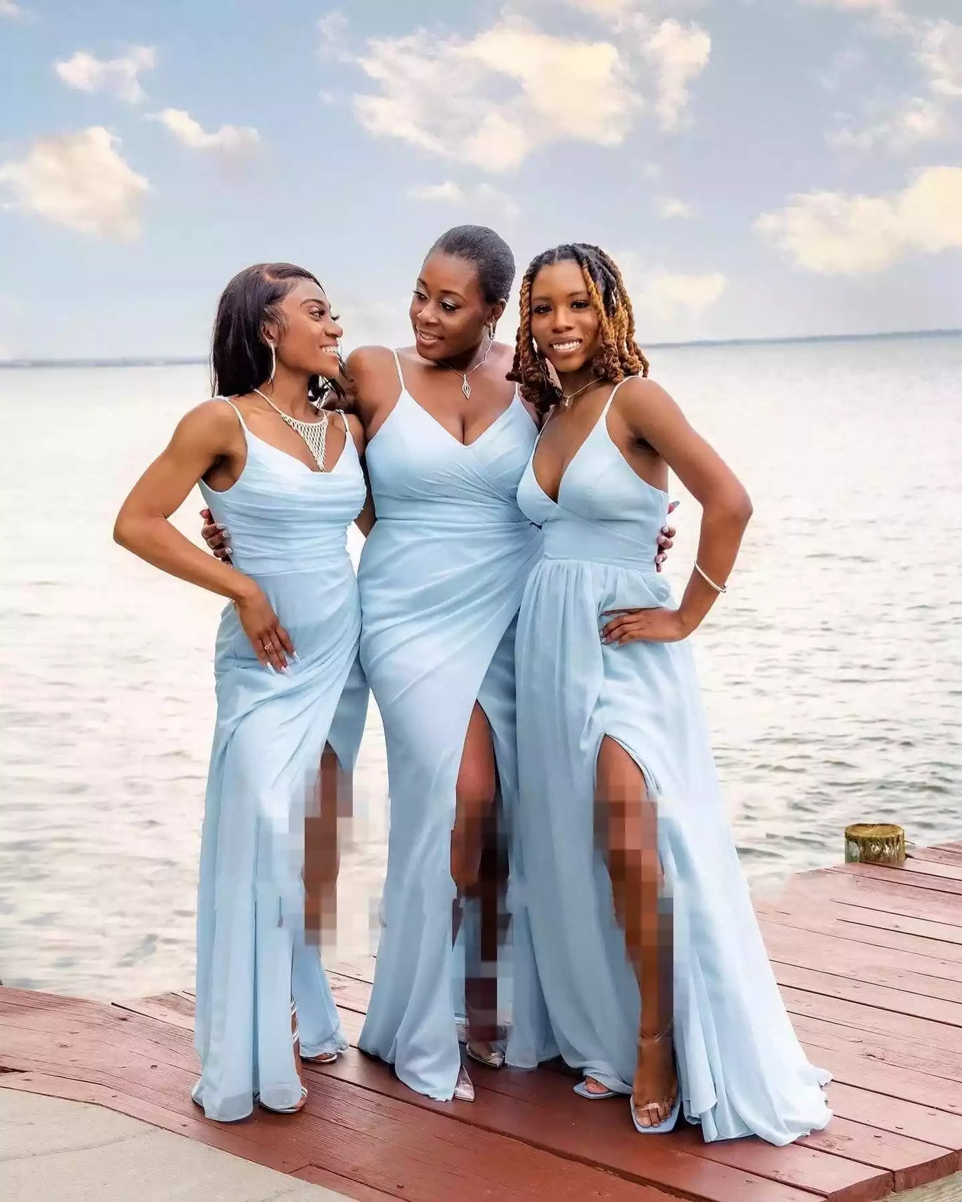 This A-line, V-neck sleeveless bridesmaid dress in light blue chiffon offers a graceful silhouette ideal for beach weddings. The lightweight chiffon fabric ensures comfort and breathability, while the sleeveless design allows ease of movement. Its elegant cut complements various body types, making it a versatile choice for bridesmaids seeking both style and comfort in a coastal setting.