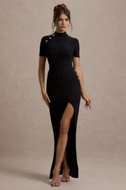Absorbing Sheath Mock Neck Short Sleeve Button Detail High Slit Floor Length Evening Dress - US 2 / UK 6 / EU 32